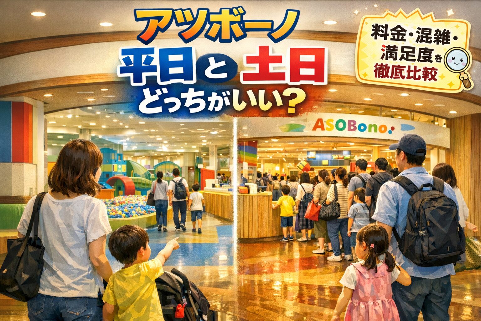 アソボーノ混雑予想|平日・土日・時間帯の傾向 東京ドームシティの人気屋内施設「アソボーノ!」は、天候に関係なく遊べるため、休日や長期休みにはかなり混雑します。 「どの時間が一番混むの?」「平日でも混雑する?」と気になる人も多いはずです。 実際に行ってみると、混雑にはかなり分かりやすい“パターン”があります。時間帯や曜日を少し意識するだけで、快適さは大きく変わります。 この記事では、アソボーノの平日・土日・時間帯別の混雑傾向をわかりやすく解説します。 読むと次のことが分かります。 平日と土日の混雑の違い 一 ...